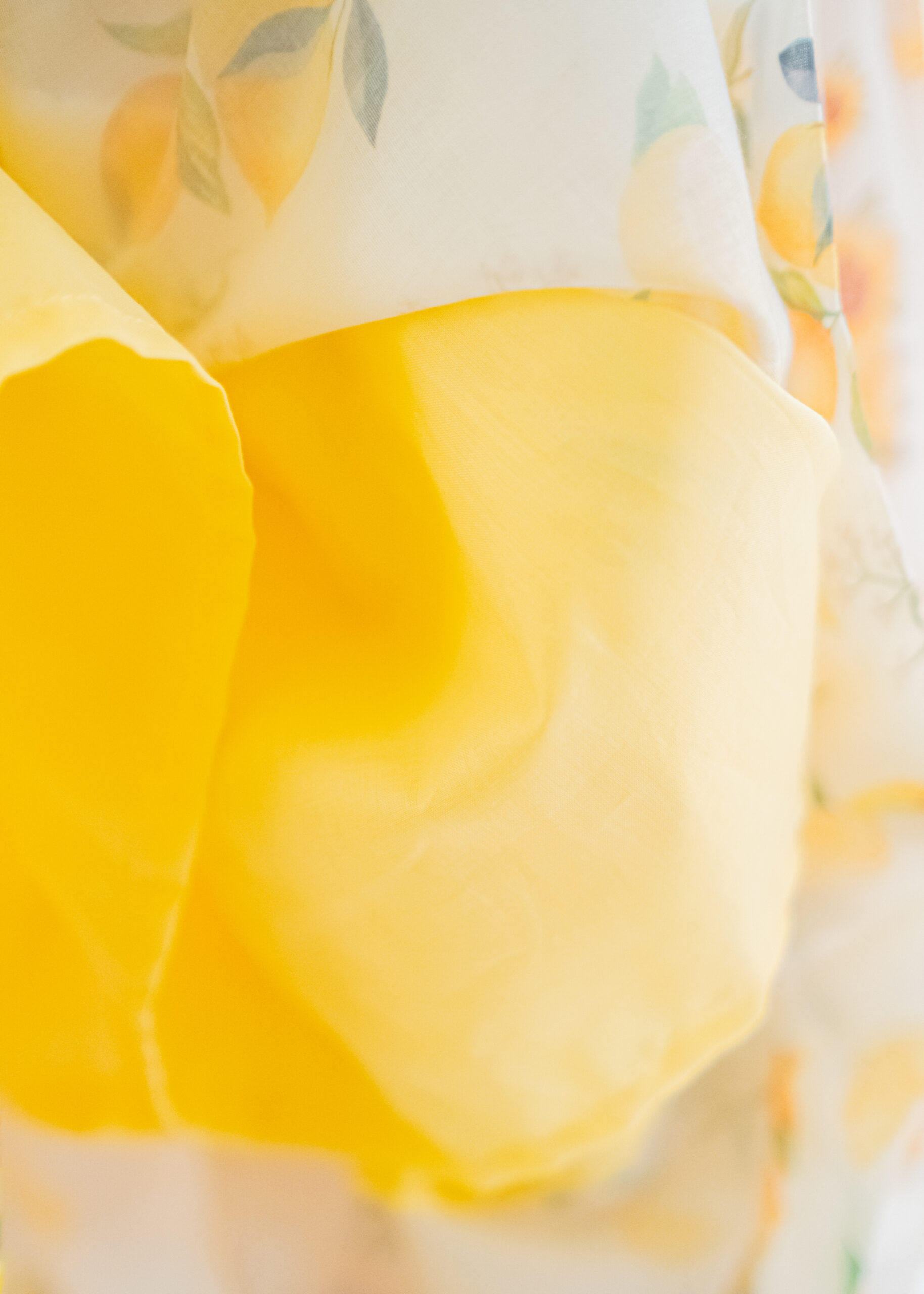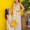 This outfit is crafted from lightweight polyester and cotton fabric.It feature a playful lemon print on a soft cream background.