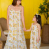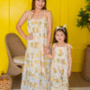 An oversized, flowy maxi dress with spaghetti straps and a relaxed fit, offering a breezy and comfortable feel. The child’s outfit is a sleeveless jumpsuit with adjustable spaghetti straps and a ruched bodice, providing a cute and comfy style. Both pieces are non-stretch, making them perfect for warm-weather occasions with a fresh, summery vibe.