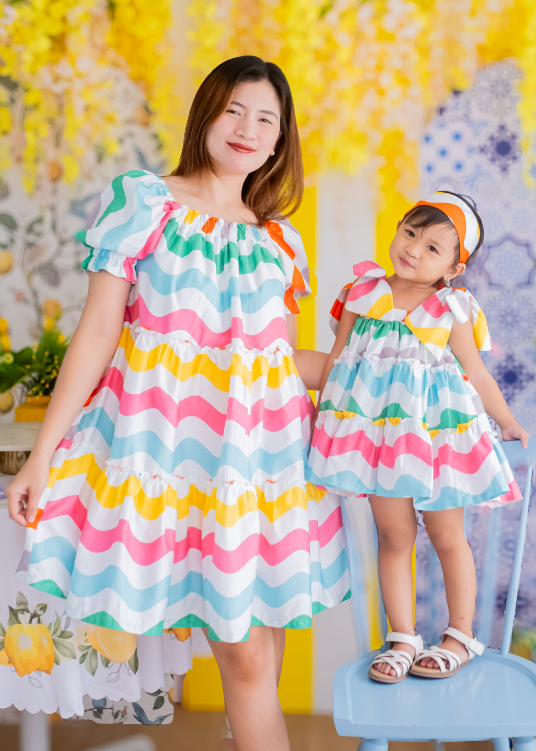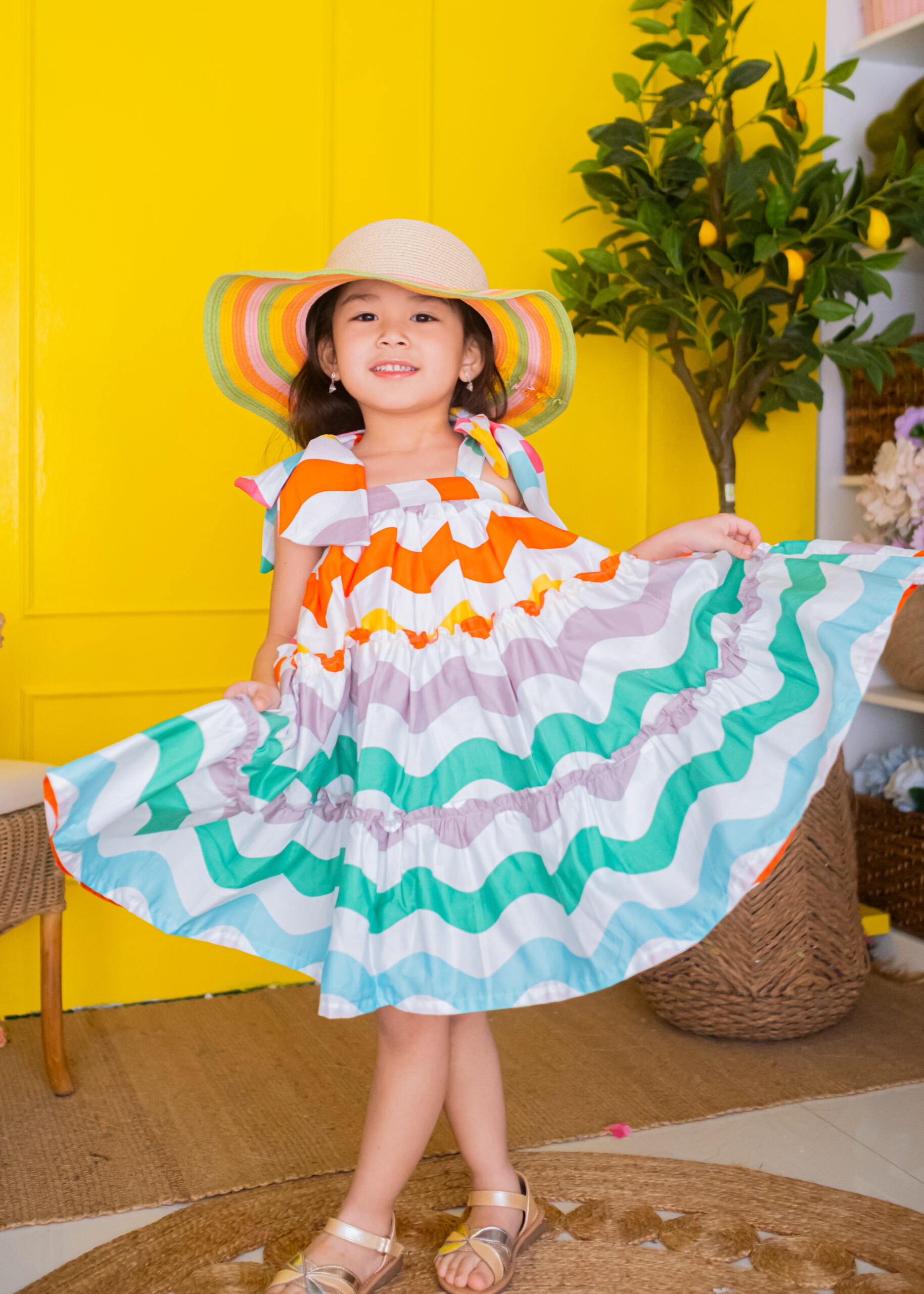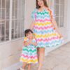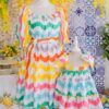 This dress features an adorable toddler girl’s summer outfit, consisting of a colorful, ruffled dress with rainbow wave patterns and matching bloomers. The dress has large, playful bows on the shoulders, adding a charming and whimsical touch.