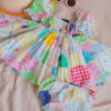 This charming patchwork dress features a playful mix of pastel colors and floral prints, giving it a vintage-inspired, handcrafted feel. The dress has a ruffled, elastic neckline that can be worn on or off the shoulders, with flutter sleeves for an extra sweet touch. Its full, twirl-worthy skirt adds a whimsical flair, perfect for a sunny day outdoors.