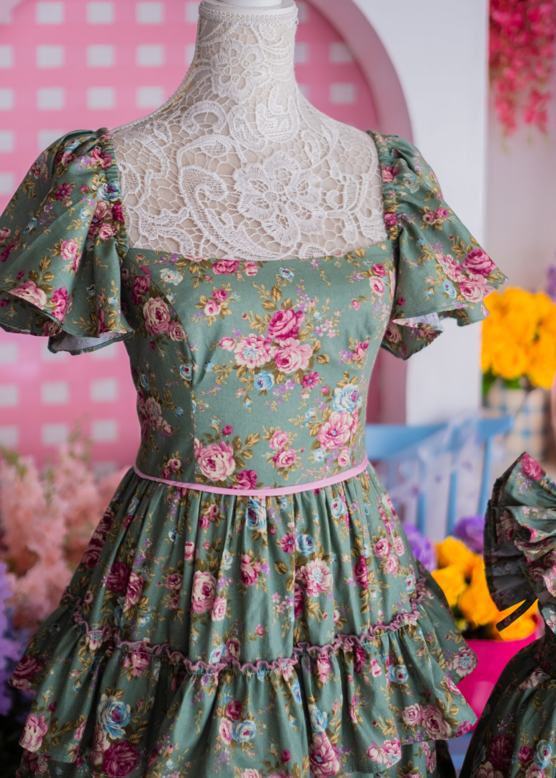 • A timeless floral ensemble featuring a romantic sage green base adorned with soft pink blooms and cascading ruffle tiers. Designed in matching mommy-and-me silhouettes, it blends vintage charm with graceful, twirl-worthy elegance.